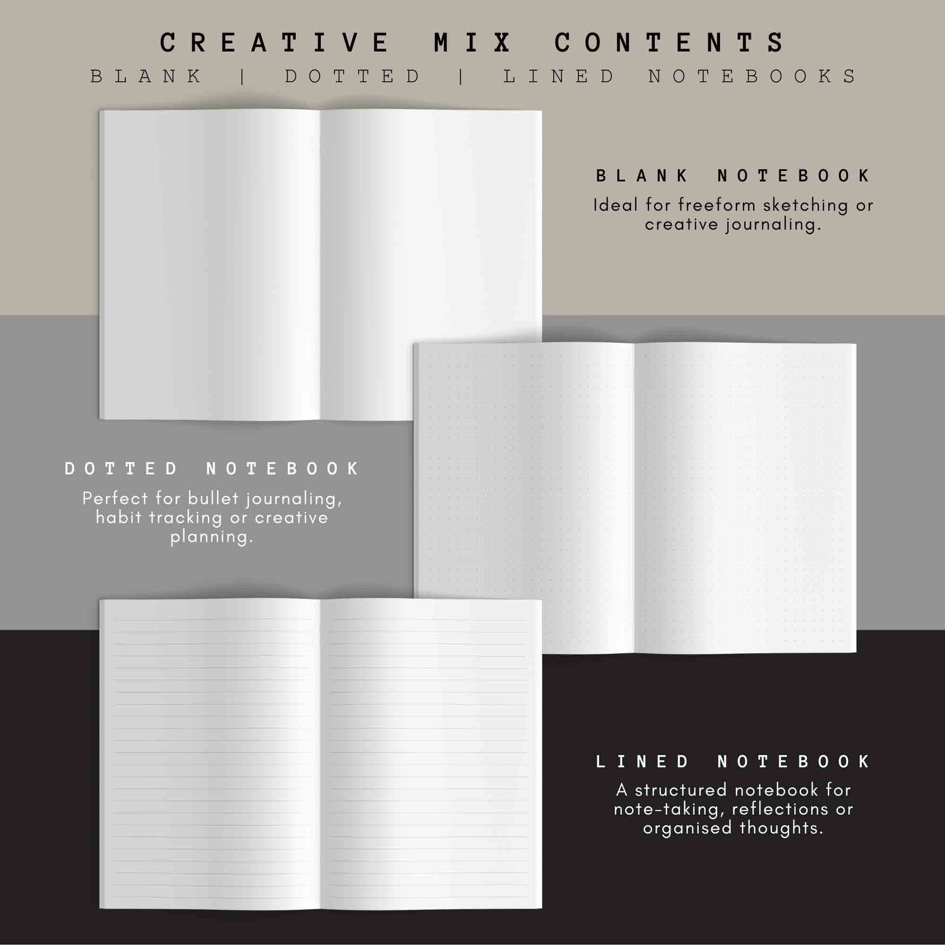 The Creative Mix provides the tools you need for creative expression and flexible planning. This bundle includes a Blank Notebook, Lined Notebook and Dotted Notebook, perfect for sketching, journaling and bullet journaling.